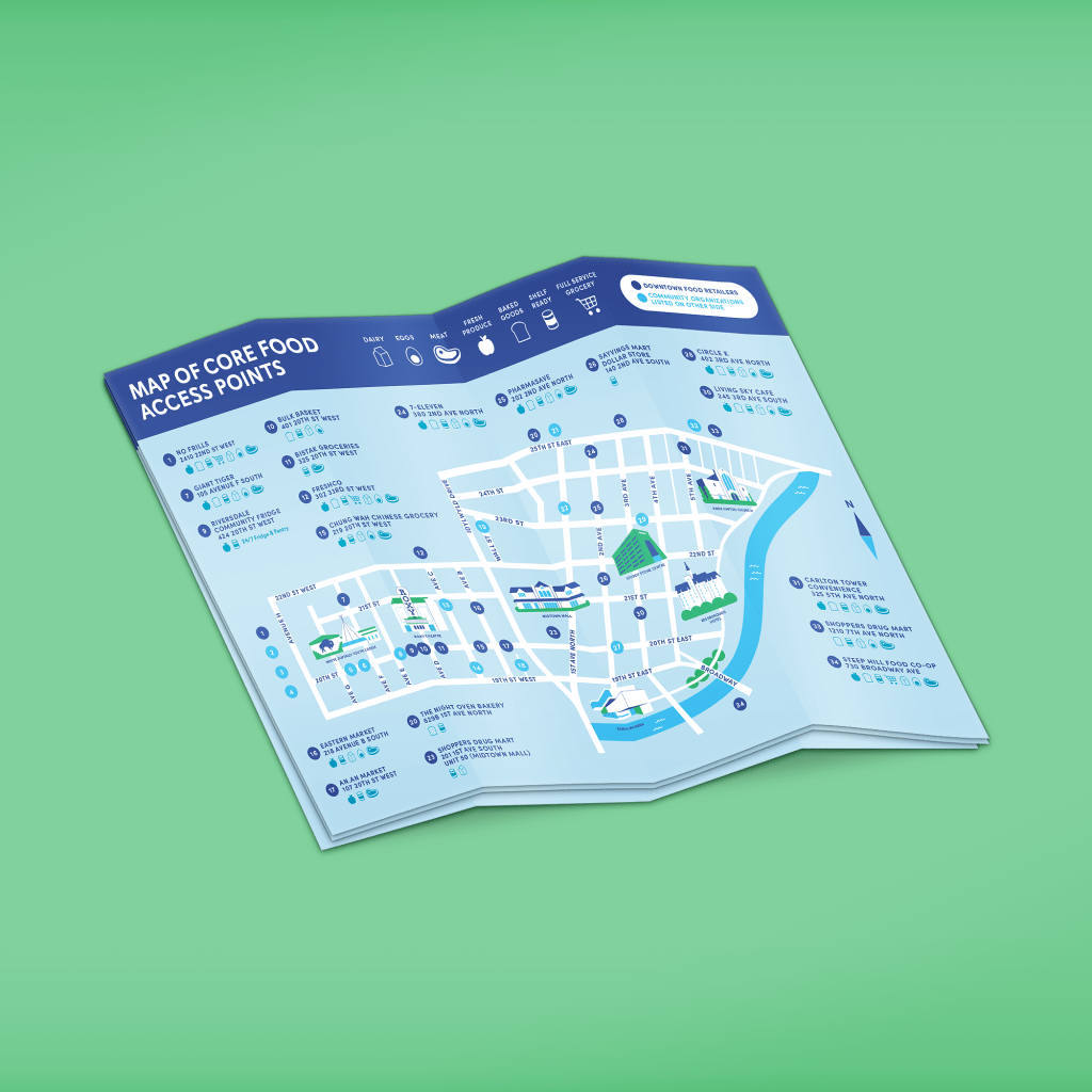 The City Centre Food Access Guide is a free resource that aims to improve food accessibility in Saskatoon’s core neighbourhoods while bringing awareness to issues of food insecurity and the lived experience of people in our communities. The guide contains the following content: